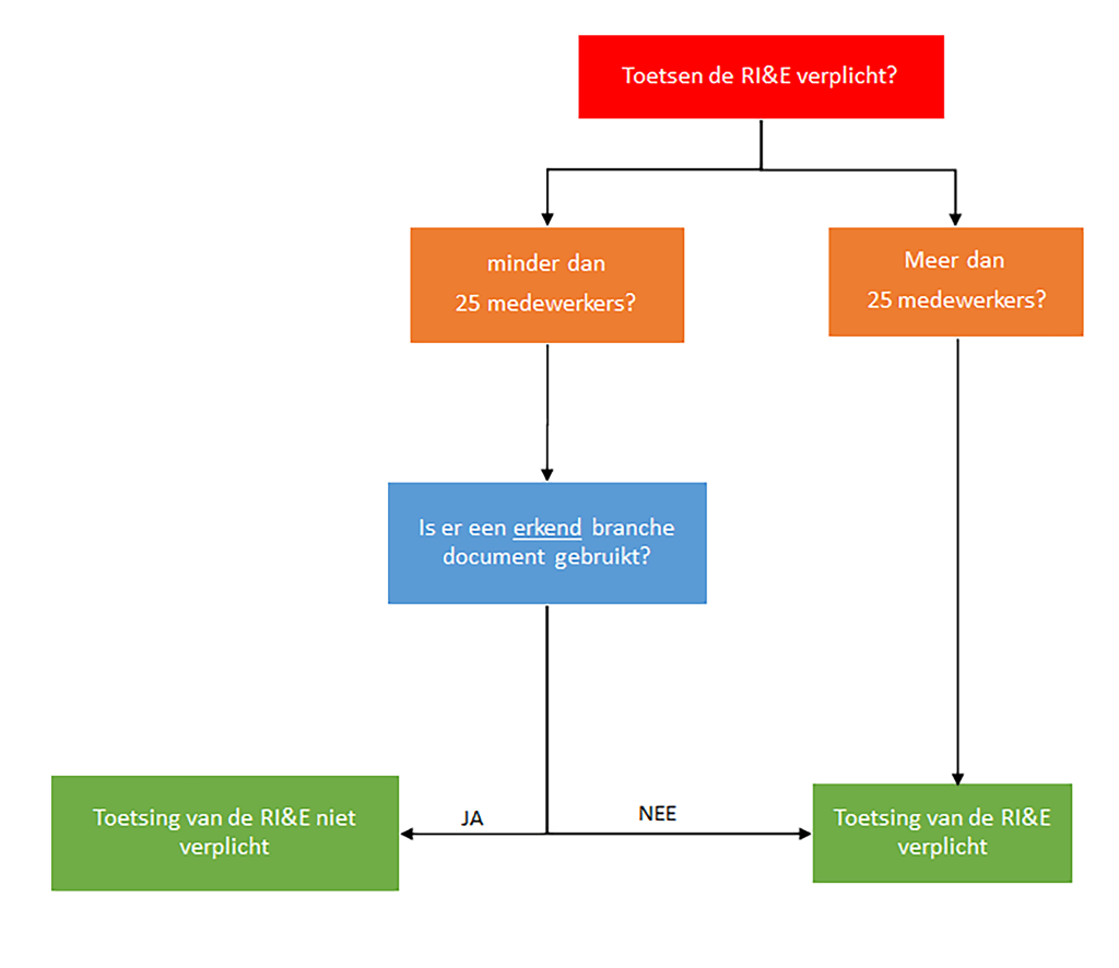 In de meeste gevallen is de toetsing van de Risico-Inventarisatie & -Evaluatie (RI&E) wettelijk verplicht. Op de afbeelding hiernaast kunt u nagaan of de toetsingsplicht ook van toepassing is op de RI&E binnen uw organisatie.